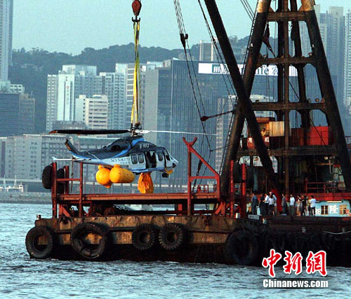7月3日傍晚,因机件故障坠落维港的直升机在湾仔水域捞起,直升机残骸仍十分完整。民航处表示,完成打捞后,会将直升机解体化验,一个月内完成初步调查报告。当天中午,一架往来香港澳门的直升机坠落维港,机上13名人员全部获救。中新社发 洪少葵 摄