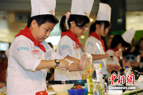 7月4日盛暑时节,10位4至12岁的香港小厨神在荷里活广场举行的“全港小厨神大赛”中比试厨艺,争夺去美国世界厨艺协会旗下C’est Si Bon烹饪学校学艺的黄金机会。中新社发 郑祚声 摄