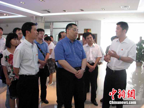 7月6日,澳门特别行政区行政长官崔世安率澳门经济财政司司长谭伯源、澳门行政长官办公室主任谭俊荣、澳门新闻局局长陈致平等一行抵达广东东莞访问。崔世安表示,澳门发展定位为世界旅游休闲中心,希望能在珠三角合作中谋求新的发展契机,让澳门经济更持续发展。图为澳门特首崔世安一行参观东莞松山湖开发区。中新社发 李映民 摄