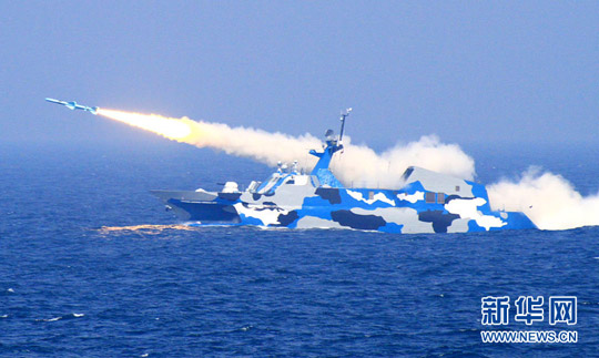 随着编队指挥员一声令下,海上战舰和空中战机发射出的一枚枚导弹飞向“敌”舰,实施有效打击;一批批来袭导弹被我舰艇编队和空中编队战机及时捕获锁定,用导弹和炮火将其迎头击落。