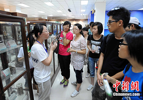7月6日下午,台湾高校学子参观位于福建中医药大学校内的中医药文化博物馆。由福建中医药大学、共青团福建省委、福建省台湾同胞联谊会联合主办的“2010年海峡两岸青年联欢节·中医药传统文化研习营”于5日在福州开营。来自台湾慈济大学和台湾嘉南药理科技大学的32名学子及福建中医药大学的部分学生代表参加此次为期两周的研习营活动。此次研习营开设有中医药文化、针灸学、养生药膳、太极拳等课程。中新社记者 刘可耕 摄