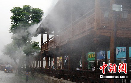 连日来,福州气温居高不下,福州古街南后街启动喷雾降温,成为市民纳凉的好去处。中新社发 张丽君 摄