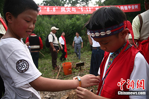 图为台湾“8.8”风灾灾区儿童为四川“5.12”地震灾区儿童戴平安珠。中新社发 张浪 摄