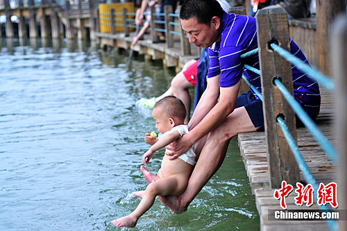 7月7日,苏州太湖国家旅游度假区湿地公园内,一对父子在亲水木廊上快乐戏水。清清太湖水,成为民众避暑好去处。中新社发 李克祥 摄