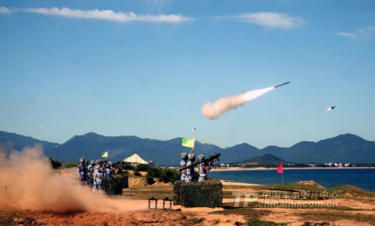 7月2日下午,南海某海岛,骄阳似火,地表温度高达50多度。南海舰队某陆战旅在炎热天气下组织某型肩扛式防空导弹实弹射击考核。15时30分,航模拖动靶标火速升空后,立即在水际滩涂上空时高时低时快时慢地飞行,其行踪极为诡秘,但刚进入射击区域,号称为“猎手”的射手们凭借平素练就的过硬本领,快速地捕获、“咬”定目标,适时地发射导弹,一举以两发齐射方式将靶标打得凌空开花。