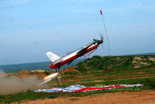 据导弹营营长张忠国介绍,此次实弹射击齐射的两枚导弹,齐出筒、齐高度、齐交汇,打出了该型号防空导弹两发齐射方式的最佳效果。图为航模起飞。 叶相成 摄