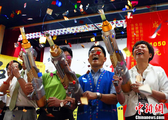 台湾旅游部门负责人赖瑟珍(右一),7月7日在台北一个旅游宣传促销活动上,同与会者一起为活动宣传造势。暑假临近,台湾旅游行业、地方政府纷纷展开旅游产业宣传促销活动活动。