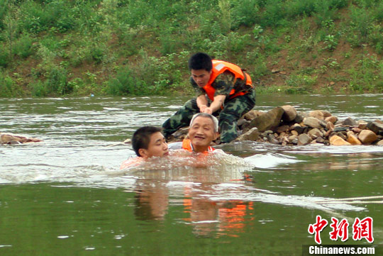 7月7日,信阳新县白果树乡三道河岸边一73岁的古稀老汉到河对岸菜地劳作,突遇暴雨,山洪突发,持续1个小时的暴雨挟持山洪将老汉困在河滩中央,在信阳消防和当地警方的营救下,老汉被救援人员用绳索从20多米宽的激流中救出。中新社发 邵伟 摄