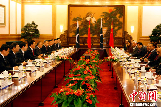 7月7日,国家主席胡锦涛在北京人民大会堂会见巴基斯坦总统扎尔达里并举行会谈及共同出席两国合作协议签字仪式。