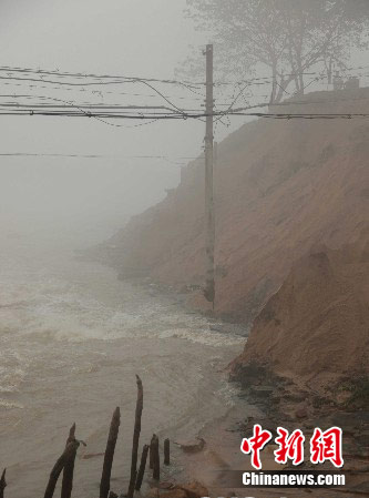 图为大沙河决堤后冲垮的电线杆。中新社发 张娅子 摄