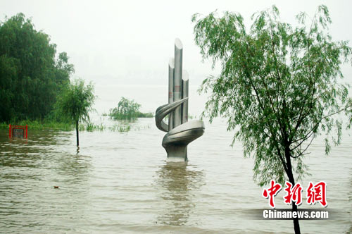 受持续强降雨及长江上游和洞庭湖来水影响,截止7月13日8时,长江武汉关水位达26.24米,超设防水位1.24米。中新社发 张芹 摄