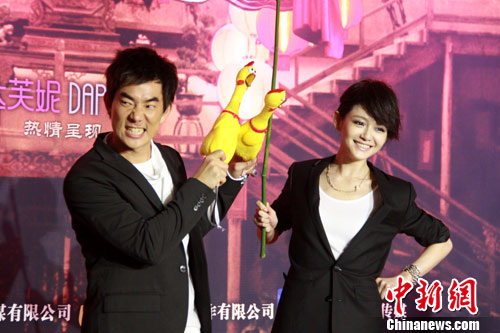 7月14日,古装爱情喜剧电影《龙凤店》在京举办首款预告片发布会,导演钟澎佳会携主演任贤齐、大S、罗家英、霍思燕、潘长江等盛装亮相。《龙凤店》由任贤齐联袂大S徐熙媛领衔主演。发布会现场,任贤齐大耍“双鸡棍”,大S也化身片中的野蛮老板娘,拿出了“藤条”现场教训了“皇帝”任贤齐一通。图为任贤齐、大S上演“双鸡棍”与藤条的对决。中新社发 李学仕 摄