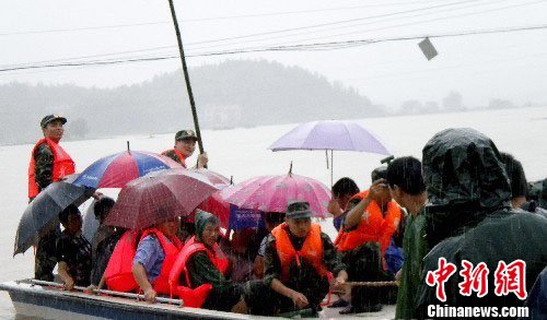 安徽池州武警官兵冒雨转移受灾民众(2)