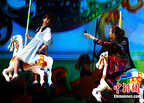 由台湾著名艺术家赖声川任编剧、导演的新作话剧《快乐不用学》即将在台湾上演,7月15日剧组在台北举行记者会,上演剧中片段供媒体宣传造势。《快乐不用学》是由香港话剧团委托赖声川创作的《水中之画》的翻版,作者以《快乐学》为理论背景、意图通过描述一对情侣和许多普通人相遇发生的故事,向人们传达人生快乐的真谛。中新社发 宋吉河 摄