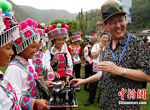 7月15日,出席亚洲政党扶贫专题会议嘉宾在云南楚雄初尝羊角酒,感受当地民族风情。中新社发 刘冉阳 摄