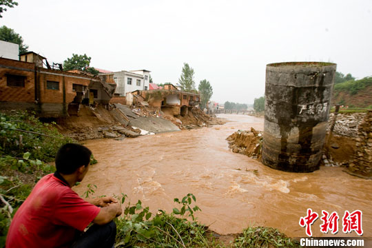 近日,河南先后遭两场大范围强降雨袭击,截止7月25日11时,全省受灾人口已达362.99万人,因灾死亡23人、失踪12人;洪灾还造成直接经济失损24.06亿元人民币。图为河南西峡县民众无奈的看着被大水冲坏的家园。中新社发 王中举 摄