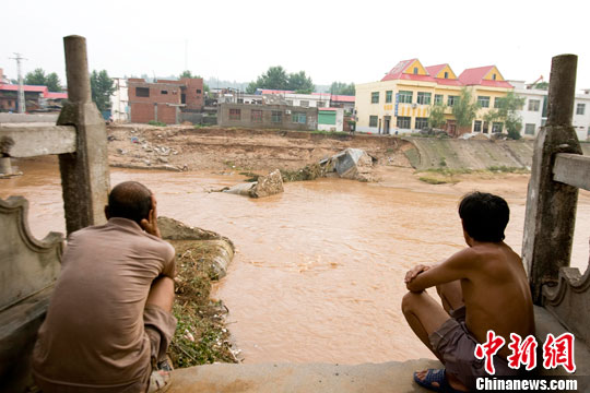 7月25日,河南西峡民众无奈地守候在被大水冲坏的大桥旁,当日的洪峰将西峡丹水镇的大桥连根拔起,将桥面和几十吨重的桥墩冲的无影无踪。中新社发 王中举 摄