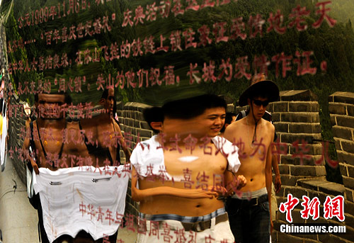 在北京居庸关长城上来自美国华盛顿的王天佑(中)和来自台湾的邱澄(右)一同登长城,有关长城的汉字解说倒影着他们的身影。中新社发 廖攀 摄