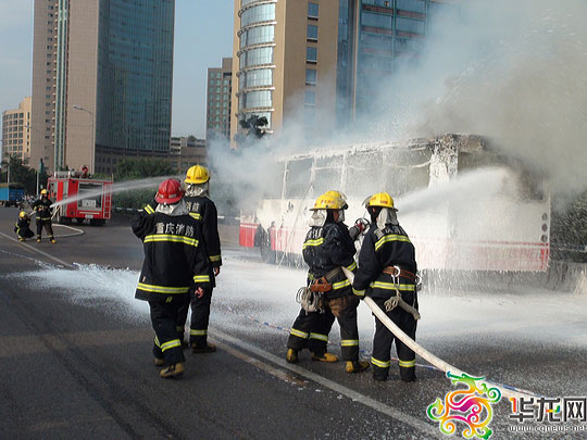图为消防人员正在全力扑救起火的公交车。