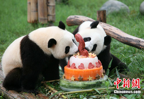 7月26日,赠送澳门特别行政区的两只大熊猫“蜀祥”和“奇妙”迎来两周岁生日。澳门代表官员、澳门民政总署大熊猫管护代表及团队、熊猫基地工作人员以及50名成都的大熊猫粉丝们一起为大熊猫开生日Party。虽然生日蛋糕是用冰制成的,但两只寿星宝宝却吃的津津有味,显得活泼可爱。两只大熊猫即将远赴澳门定居,这是他们在家乡过的最后一次生日。图为“蜀祥”和“奇妙”分享生日蛋糕。