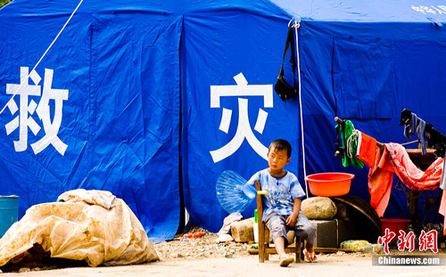 7月26日,河南淅川县,一名儿童在救灾帐篷外休息,连日来,受强对流天气的影响,强降雨席卷了河南13市70多个县市、区。据初步统计,目前仅洛阳洪灾已造成该市4个县市、区37人死亡,19人下落不明,当地著名的世界文化遗产龙门石窟景区已被迫关闭,暂停向中外游客开放。中新社发 王中举 摄