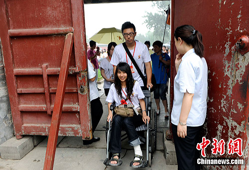 7月26日,2010年海外华裔及港澳台地区青少年“中国寻根之旅”夏令营营员分别在北京故宫、长城、颐和园、天坛等景点游览,感受祖国历史文化,增进对祖国的了解。图为台北女孩芮珊在同学帮助下坐在轮椅上游览颐和园,芮珊参加本次夏令营前在台湾不小心伤了右脚,但是她坚持参加
