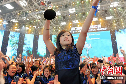 7月26日上午,获得第六届世界合唱比赛冠军的中国香港合唱队员们喜极而泣。中新社发 袁云 摄