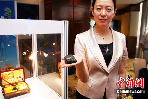 7月26日,山东昌乐县县长曹晓楠在香港向记者展示一颗重1764.8克拉的蓝宝石原石,向全球征集打磨方案。当天,山东昌乐县在香港举行“第九届山东昌乐国际宝石节推介会”。中新社发 洪少葵 摄