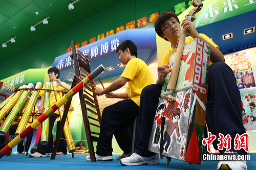 7月26日,第六届全国青少年未来工程大赛在中国科技馆拉开帷幕,来自中国11个地区的300多名中小学生通过地区赛的层层选拔,最终站在了全国总决赛的赛场上。图为北京五中分校的创意环保乐队用各种回收材料制成的乐器演奏校歌。中新社发 富田 摄