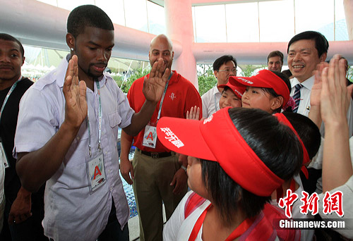 7月26日,NBA火箭队球星亚伦·布鲁克斯及蔡斯·巴丁格带领中国安徽省肥东县白龙镇双庙村亚历山大统一希望小学的孩子们参观上海世博会台湾馆,亚伦·布鲁克斯还与孩子们击掌互动。中新社发 潘索菲 摄