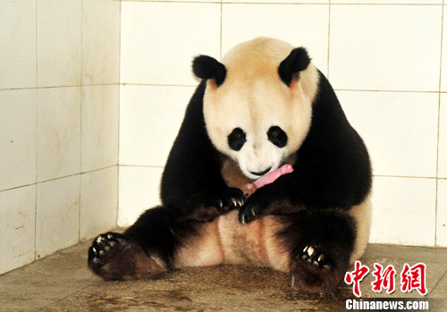 7月27日上午10时49分,卧龙·中国保护大熊猫研究中心大熊猫“菊笑”在雅安碧峰峡基地诞下了一只小宝宝,这是“菊笑”第一次生产,同时也是该中心今年出生的第二只幼崽。 由于这是“菊笑”的初次生产,所以宝宝刚落地时,“菊笑”显得有些不知所措,但很快宝宝的叫声就刺激了它的母性,它将宝宝从地上轻轻叼起来,抱在怀里不断地变换姿势,动作稍显生疏。宝宝随后就在“菊笑”的怀里安静下来。目前尚不清楚幼仔的性别,从现场目测来看,宝宝身体非常健壮。中新社发 衡毅 摄