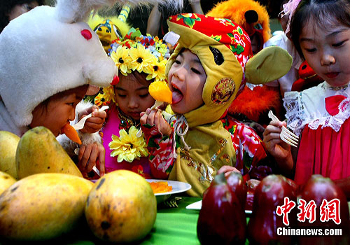 北京蓝天儿童艺术团的孩子们,7月27日在台北参加认养台湾灾区农业水果活动,这个艺术团将在台湾进行大型歌剧公益演出,以支持在八八风灾中受损的农户,演出结束后他们还将前往台北县举行爱心捐赠活动。中新社发 宋吉河 摄