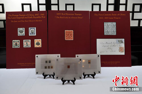 为配合将于本月31日至下月1日假香港柏宁酒店举行的“中国邮票珍品大型拍卖会”,主办机构7月27日在香港举办新闻会,并向媒体预展中国清朝经典邮票及1911年至1949年中华民国时期的“民国五珍”。中新社发 郑祚声 摄