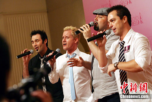 7月27日,国际著名声乐组合Metro Vocal Group成员(左起)Kevin 、Eric 、Sean及Mike在香港登台献艺,演唱粤语歌。他们将在8月1日举行的《2010香港小姐竞选决赛》上演出。中新社发 洪少葵 摄