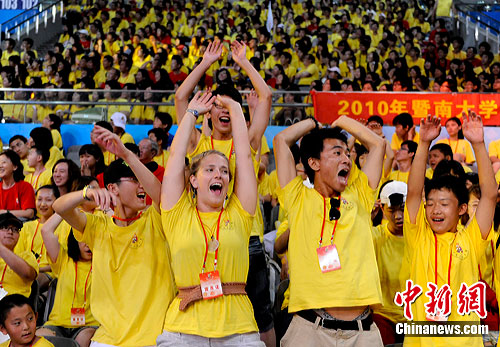7月27日,中国寻根之旅夏令营联欢晚会在北京国家体育馆举行。参加夏令营的6000余海外华裔青少年欢聚一堂,愉快联欢。中新社发 廖攀 摄