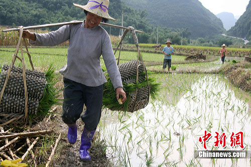 7月27日,广西罗城县乔善乡板团村农民在挑秧进田,准备抢种晚稻。吴耀荣 摄