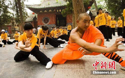7月29日下午,河南登封,一群身着黄色功夫衫、黑色功夫裤和练功鞋的华裔青少年出现在少林景区,他们跟着少林武僧师傅们学起了少林功夫“五步拳”。中新社发 王中举 摄