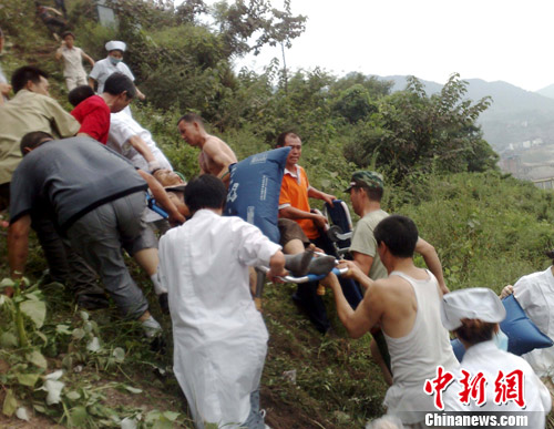 7月31日下午15时50分左右,四川达州宣汉县汽车运输总公司一辆客车在宣汉驶往樊哙镇途中坠崖,造成车上乘客当场死亡11人,送往医院抢救途中死亡2人,轻重伤9人。目前,伤者正在当地医院接受治疗,有关善后事宜正有序进行。图为事故现抢救人员正在将一名伤者抬上公路。中新社发 陈英 摄