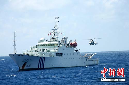 中国国家海洋局南海分局23日透露,前往俄罗斯参加太平洋安全合作演练的中国海监83船与中国海事海巡11船,于23日上午和俄罗斯Primorie号巡逻舰、韩国JEMIN11号巡逻舰在预定海域集结,组成第二国际编队,开始执行太平洋安全合作演练任务。图为中国海监83船和B-7112直升机在海上执行演习任务。