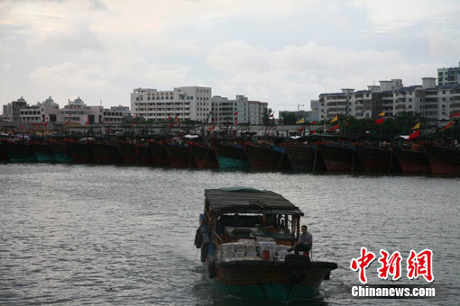 受今年第5号热带风暴“蒲公英”影响,8月23日17时起,琼州海峡全面停航。图为停泊在海口新港码头避风的渔船。中新社发 付美斌 摄