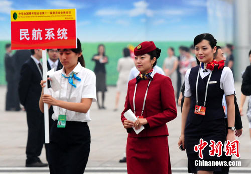 8月24日上午,来自民航系统的青年代表身着漂亮的空姐制服,准备步入北京人民大会堂,出席中华青年联合会第十一届委员会全体会议、中华全国学生联合会第二十五次代表大会开幕式。