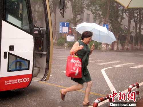 8月24日,广东省受“蒲公英”外围环流影响,珠江三角洲大部和粤西有大雨到暴雨,广州街头行人匆匆避雨。