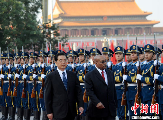 8月24日,中国国家主席胡锦涛在北京人民大会堂东门外广场举行仪式欢迎南非总统祖马访华。中新社发 廖攀 摄