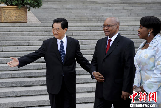 8月24日,中国国家主席胡锦涛在北京人民大会堂东门外广场举行仪式欢迎南非总统祖马访华。中新社发 廖攀 摄