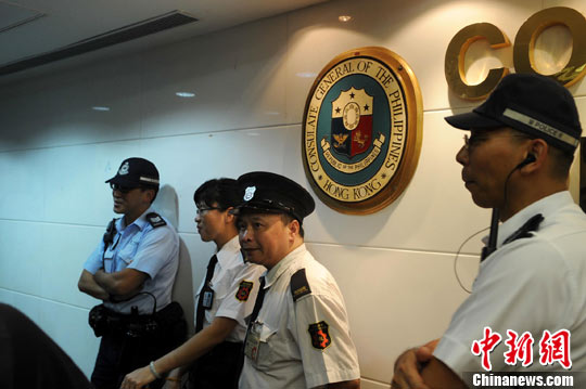8月24日,香港有多个团体及市民到菲律宾驻港总领馆要求菲政府彻查劫持杀害香港旅客残暴事件。为维护菲驻港机构及周边地区安保,警方调配充足警力维护秩序。中新社发 郑祚声 摄