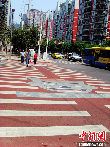 中新网重庆8月29日电 (孟幻)8月29日,新学期即将开始,一条位于重庆珊瑚小学附近的斑马线早已焕然一新,出现了“喜羊羊”与“灰太狼”的图案,并印上安全标语提醒过往行人安全过马路。