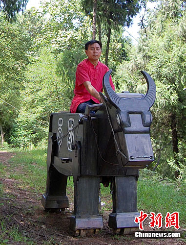 9月7日,四川广元木匠何多现展示花了5个多月造出的“木牛流马”。何多现2010年3月开始制作,8月初完成。“木牛流马”长2.08米,高1.4米,自重230斤,腹中可载420-450斤大米,后肢可以前后屈膝,以手推或牵为动力,可以行走在乡间小路,还可爬坡上行。