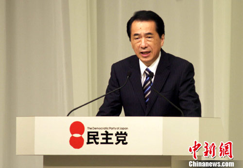 9月14日下午2时,日本民主党在东京王子花园塔酒店召开临时党大会,进行新民主党党代表的选举。结果,菅直人以721分大幅领先小泽一郎的491分,成功连任民主党党代表,继续担任日本首相。图为菅直人发表连任感言,他表示:“日本现在面临各种困难,我要把现在的日本变成健康的日本,并把它传给下一代!” 中新社发 孙冉 摄