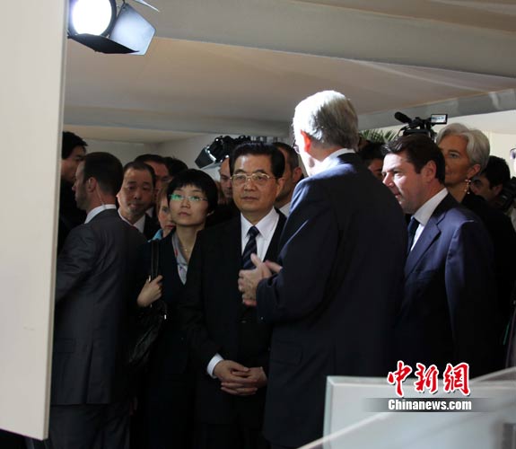11月6日上午9点多,中国国家主席胡锦涛和夫人刘永清乘车前往位于尼斯以北卡罗斯生态技术园内的施奈德电气集团卡罗斯中心。这场参观历时约40分钟,是胡锦涛此次法国之行的最后一场活动。图为胡锦涛听取对方介绍情况。