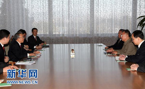12月9日,朝鲜劳动党总书记、国防委员会委员长金正日(右二)在平壤会见了中国国务委员戴秉国(左二)。双方就中朝关系和半岛局势进行了坦诚、深入的谈话,达成重要共识。戴秉国应邀于12月8日至9日访问朝鲜。访问期间,戴秉国同朝鲜内阁副总理姜锡柱举行会谈。